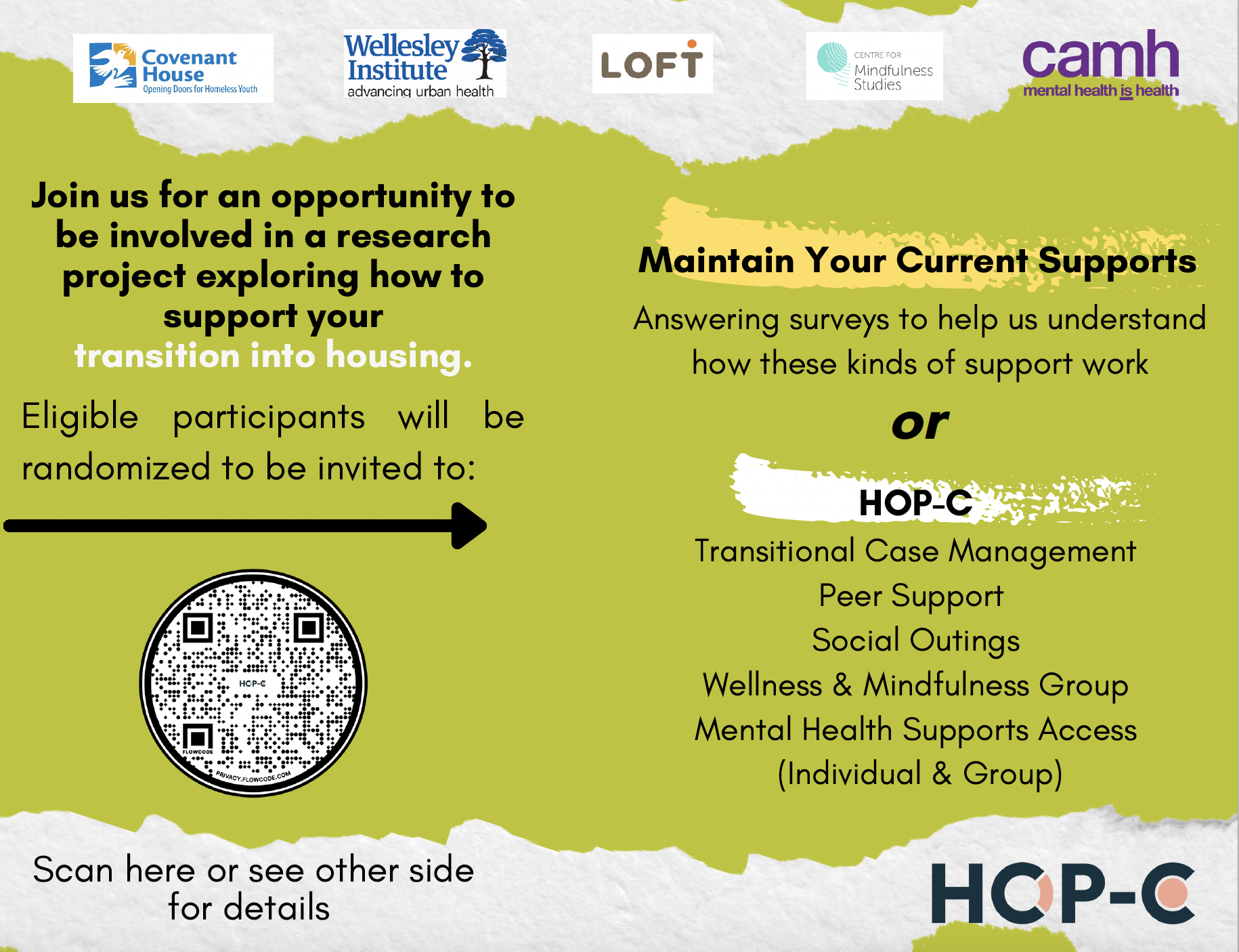The HOP-C Research project is a collaboration between LOFT Community Services, CAMH, Covenant House, the Wellesley Institute and the Centre for Mindfulness Studies. This research has been reviewed and approved by CAMH’s Research Ethics Board. Please contact sean.kidd@camh.ca if you have any concerns.