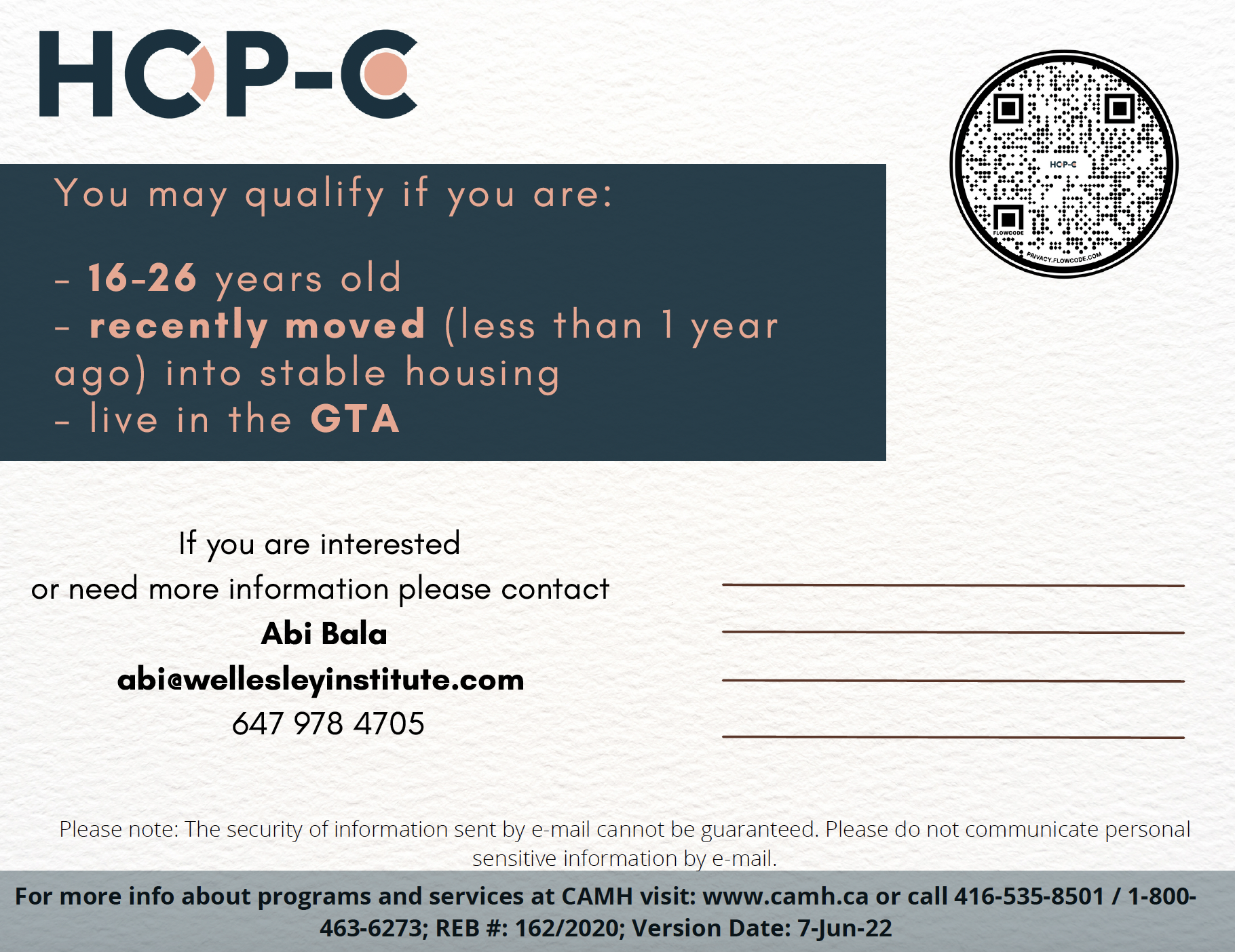 1. Sign Up: Reach out to the HOP-C Research Assistant Abi Bala (abi@wellesleyinstitute.com)