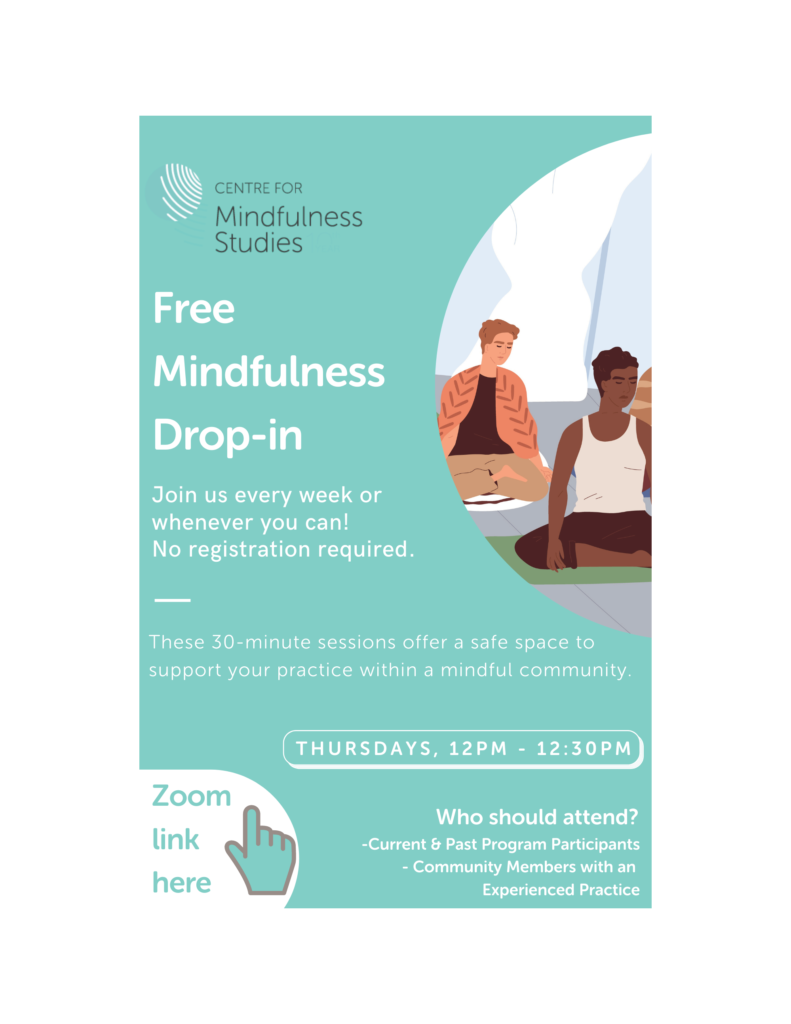 The Mindfulness Drop-in is part of the Centre for Mindfulness Studies’ services that were transferred to Reconnect Health Services as of June 1, 2025. To learn more, please read the full joint announcement here.